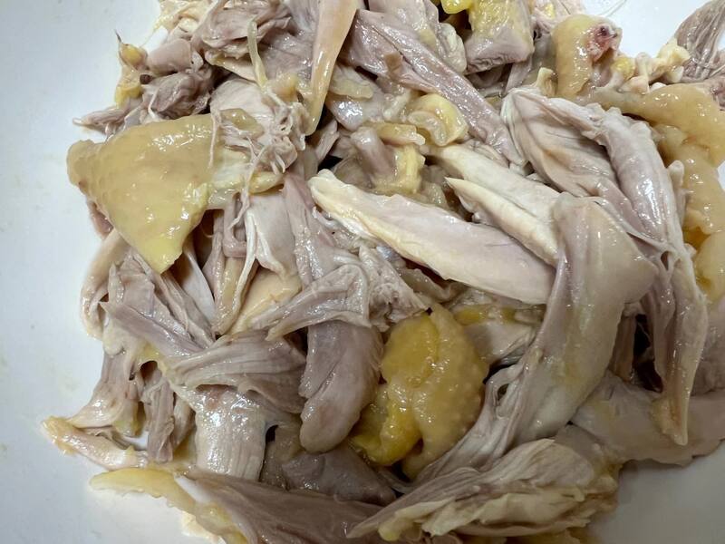 - Xé hoặc thái thịt gà: Khi gà chín, vớt ra, để nguội một chút rồi xé hoặc thái miếng vừa ăn, đảm bảo thịt mềm, ngọt tự nhiên.