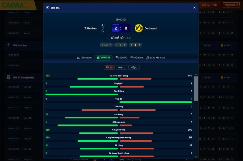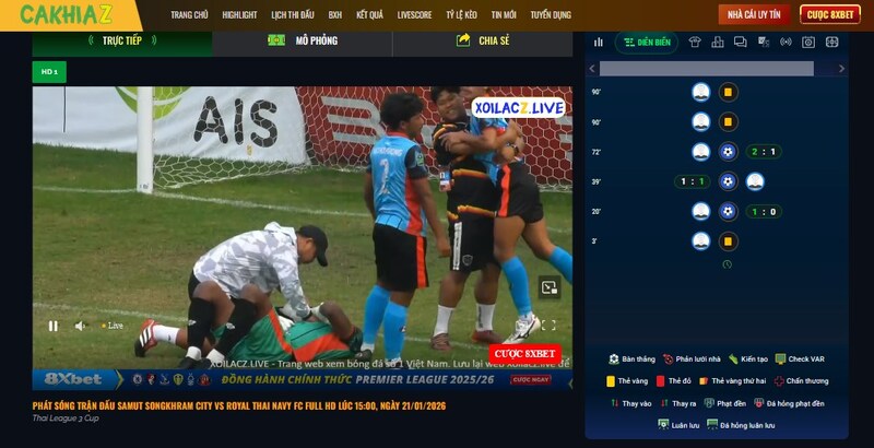 Khác với nhiều trang chỉ hiển thị tỷ số cuối cùng, Cakhia Live cung cấp hệ thống kết quả và livescore rất chi tiết. Trong lúc trận đấu diễn ra hoặc sau khi kết thúc, bạn có thể theo dõi đầy đủ các thông tin quan trọng như: